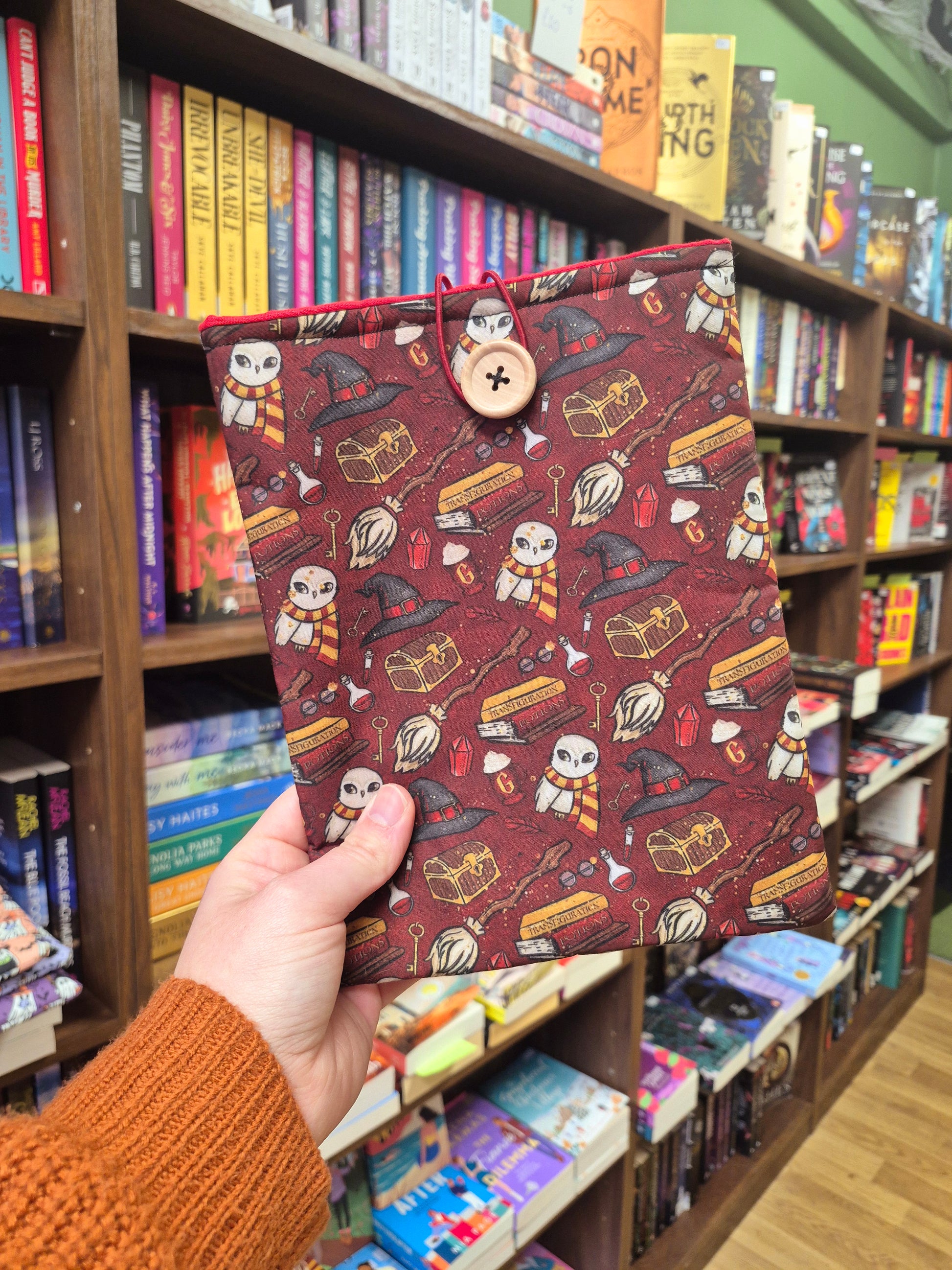 These book sleeves feature a button and elastic closing at the top, which are both colour coded to the fabric to compliment the whole design.